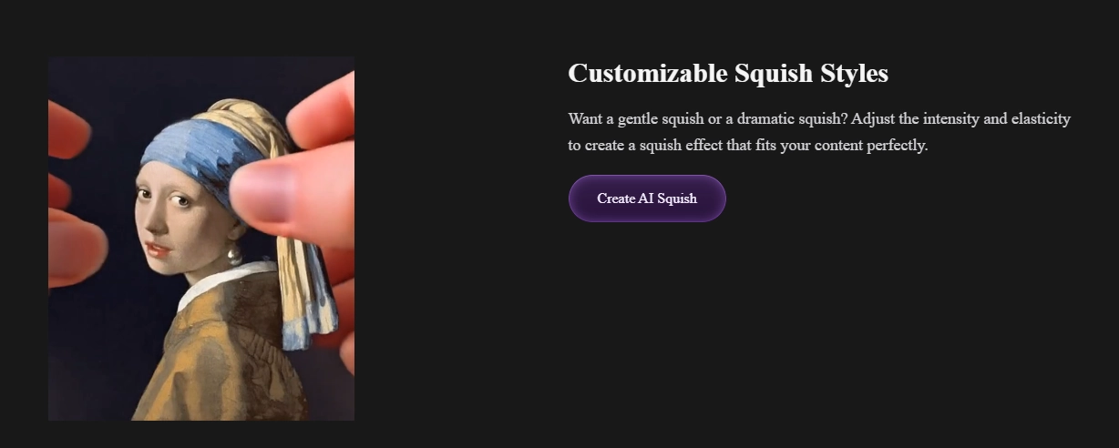 An AI squish effect transforms normal objects(or human) in images like soft jellies or mochi toys. Usually, the effect will turn still pictures into stretchy and bouncy animations.