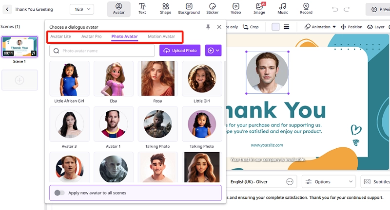 With Vidnoz AI Video Generator, you can easily choose the AI avatar that best fits your thank you message. You can pick from a wide selection of Pro Avatars, designed with highly real and professional expressions. There are also Photo Avatars, created by uploading any photo to generate a lifelike talking avatar. It also has the option of Motion Avatars which are perfect for adding dynamic gestures and emotions.