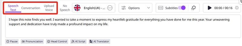 - AI voiceovers note reading: AI voiceovers can read your thank you note aloud with natural expressions.