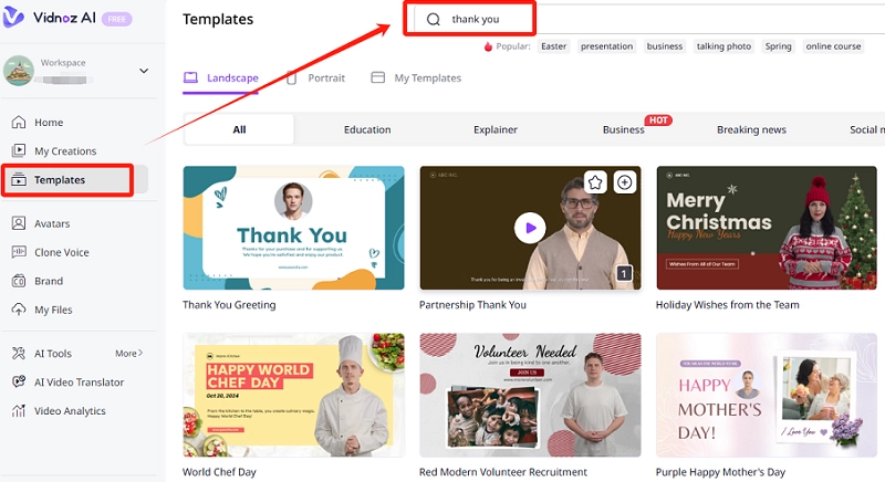 - A large collection of thank you video templates: Vidnoz has hundreds of AI video templates, with each different from one another as per your needs.