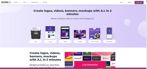 Designs.ai draws on AI technology to provide everyone with the simplest solution to create professional designs in seconds. On this website, you can generate and personalize any elements for your website and pages, from text to logo, video, image, social media banners, and so forth. It promises to simplify the creation workflow and helps you scale up design in seconds.