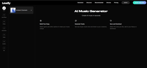 Benefiting from the development of AI, now people can create professional-sounding music with less effort and cost. Loudly is such an excellent choice for it. This AI music generator allows users to generate and customize music in seconds. Various featured genres can be found on this platform for you to create stylish music for your projects. Moreover, Loudly has a good collection of royalty-free music waiting for your exploration.