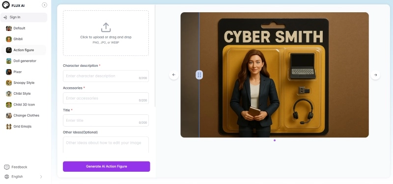 Fluxai.art is a powerful AI image generator, and also specializes in free AI action figure generator. It has a user-friendly interface that allows you to separately enter character description, Accessories, Title, Aspect Ration and other prompts easily, which means you don't need to write complex prompts anymore. Of course, you can also customize the art style with the description in “Other Ideas(Optional)” to transform your photo into a unique AI-generated action figure.