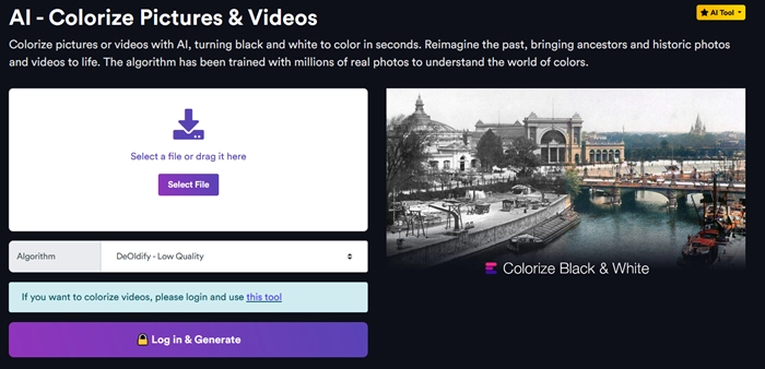 Editingtools.io is another excellent tool that lets you colorize pictures or videos with AI, turning black and white to color in seconds. This remarkable video colorizer online tool leverages advanced AI technology to analyze your footage and automatically apply the most suitable colors, thanks to its deep AI video colorization capabilities. Its automated process ensures simplicity and accessibility for users of all skill levels. Editingtools.io excel as an AI video editor, it also serves as a robust editing tool, encompassing an array of features such as cropping, resizing, and rotating. With its comprehensive range of functionalities, it serves as a convenient all-in-one solution for all your video editing requirements.