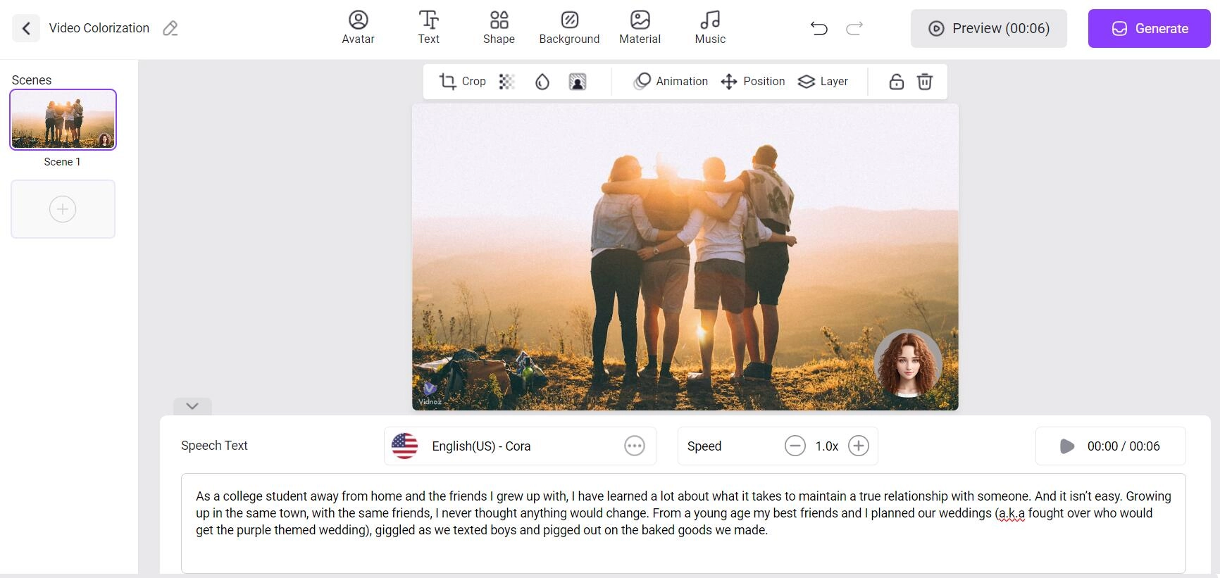 Vidnoz AI enables you to upload a video as resource into your project. It offers an array of editing features to enhance your video. Besides basic cropping, you can add text/subtitle, image and music and apply text animation, transitions and other effects. Additionally, it allows you to add a realistic avatar to make an AI talking head with perfect lip-syncing as presenter to introduce your video. The AI video generator also builds in an AI text to speech engine to transfer your script into voice over in multiple languages.