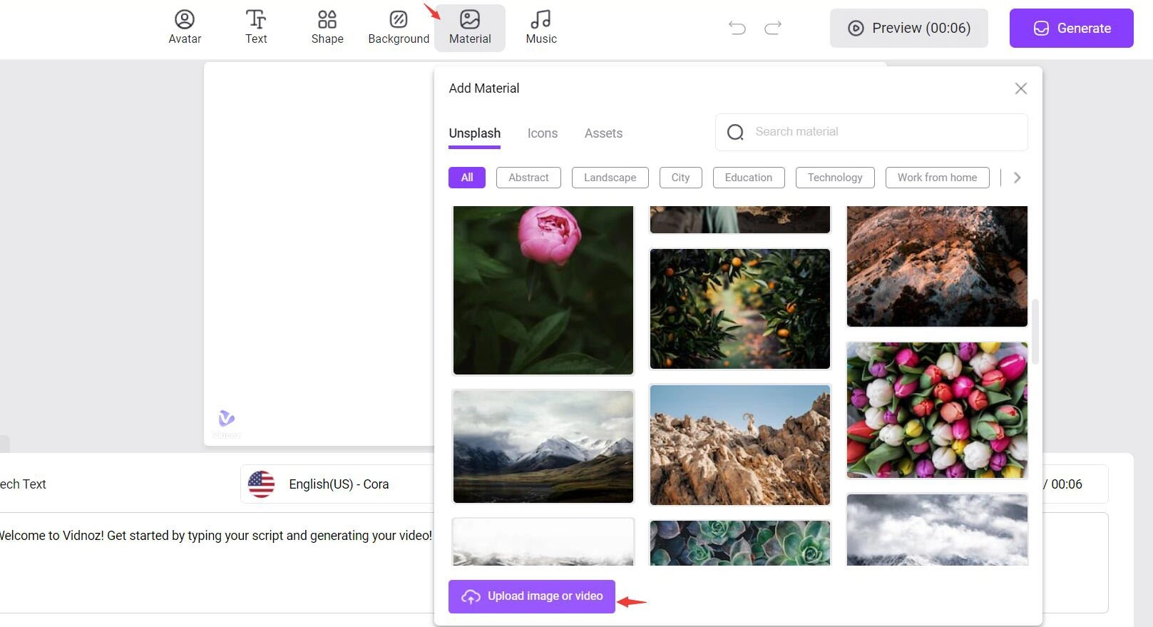 Step 3. Click Material > Upload image or video and import the colorized video.