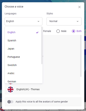 Set audio options like recording a voiceover, selecting a pre-recorded audio file, or computerized voice in the desired language. Additional options control voice speed and style.