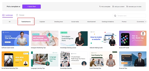 Choose from ‘Tutorial/How-to’ for desired tutorial content types. Templates contain preset animated characters, scene layouts, and effects.