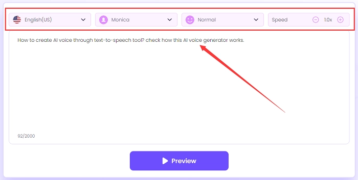 Step 3. Copy and paste the text to the text section and click the Preview icon to generate an audio track.