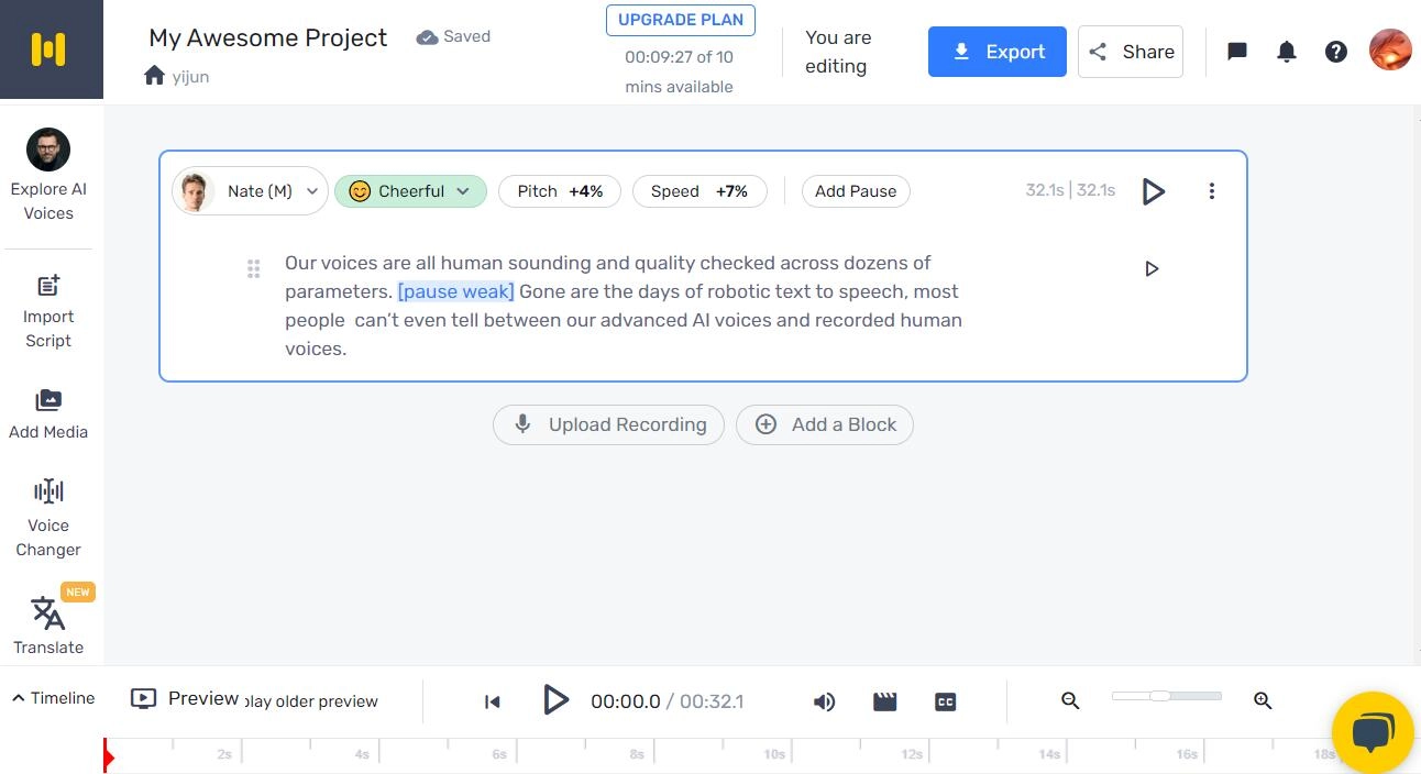 Murf AI has a selection of AI voices varying from gender, age and accents across 20 languages, for example a young female voice in British accent. Customization features bring the AI voice synthesizer to the next level. You can set an emotion (general, cheerful, sad etc.) for the speech. You can also adjust pitch/speech, add pause, manage pronunciations to make the voice over sound the way you want.