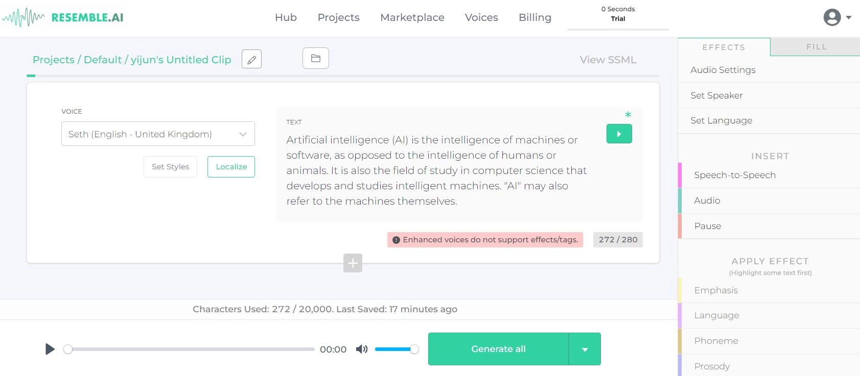 Resemble AI presets tens of voices in up to 100 languages helping you reach global audiences. It gives an array of settings to personalize speech synthesis. You can add emotions to your voice, happy, sad, angry or more; you can add background music for the speech; you can add a pause in your content and so on. What’s more, you can output the speech in MP3 or WAV with audio settings.