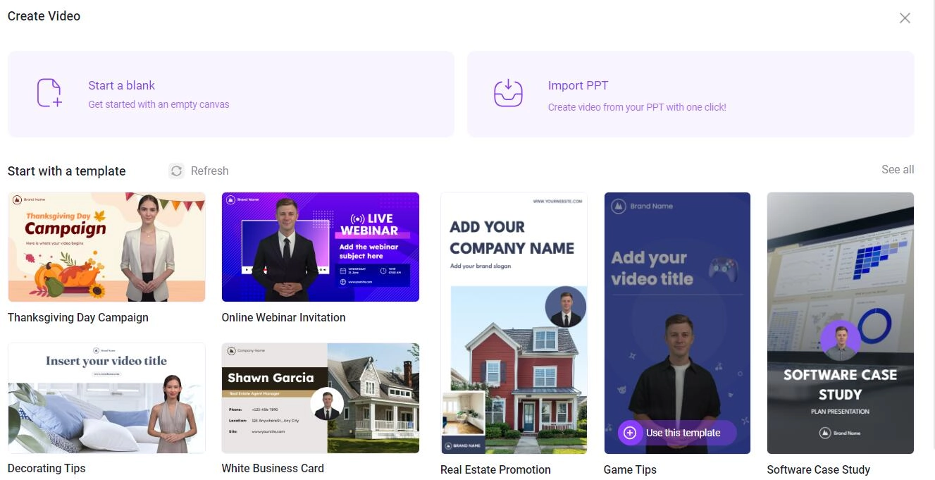 - AI video templates: 200+ video templates drive you to create a video faster and easier. All templates are well organized in different categories depending on use cases, for example, training videos, e-learning videos, sales videos, greeting and invitations videos etc.