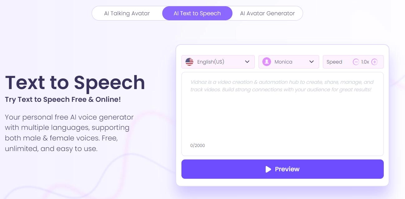 Vidnoz AI Text to Speech is an AI voice synthesizer and generator included in Vidnoz AI toolkit. It comes as an online app to create high-quality synthetic speeches from plain text. It specializes in delivering human-like, natural-sounding and engaging voices, no robotic or odd.