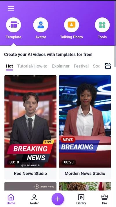 Step 2. Go to Home > Template. Choose a template and edit. You can change the avatar, type texts to be processed to voice, add stickers and music...