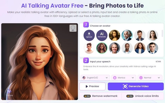 Vidnoz AI Talking Avatar is the AI tool that converts the person or animal in an image to living beings who can speak. You can control what content, language and voice they say. You can generate a talking head with a description and use it to transform text to speech. Finally, download it as a video and insert it into your YouTube channel video without showing your face but the talking head will say all for you.