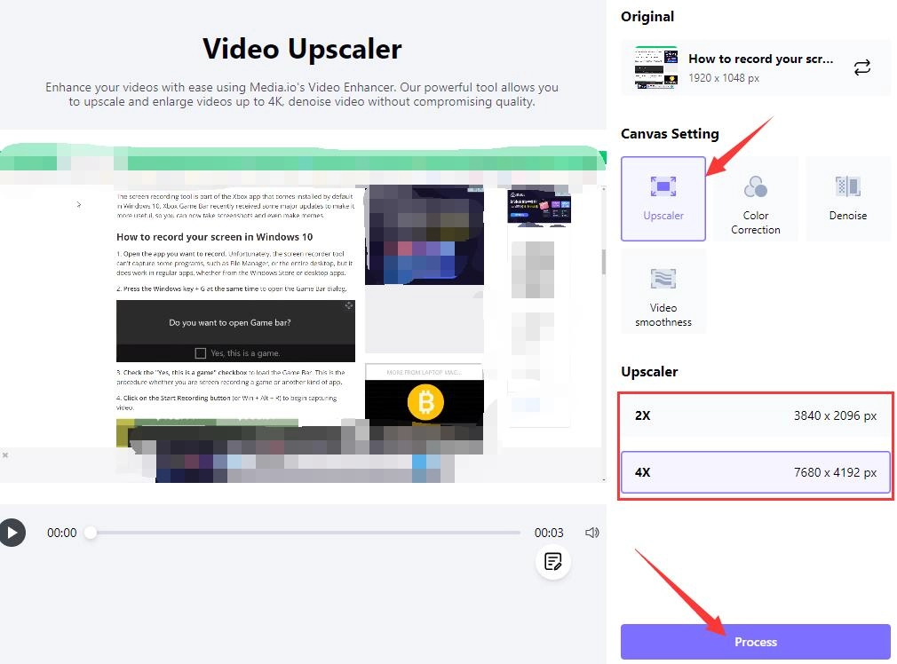 Step 3. After uploading your video, choose video resolution you want. There are two options 3840 x 2096 px (4k) or 7680 x 4192 px (8K). Then click Process and wait for AI process in seconds.