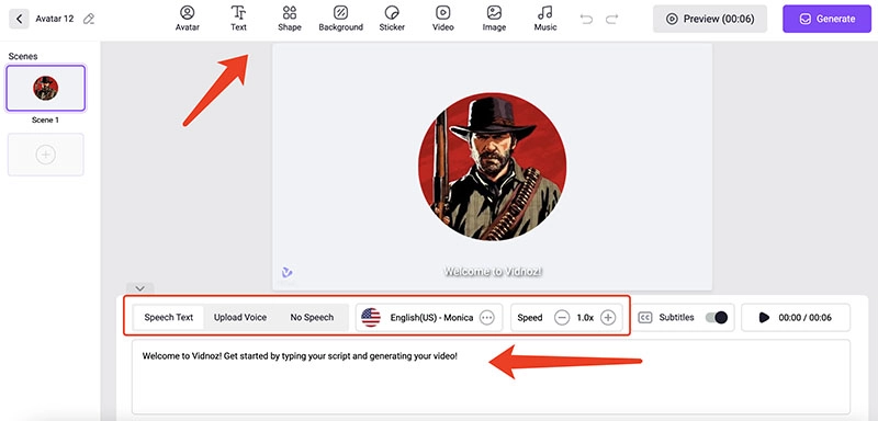Step 3. Input the text that needs to be converted to audio. Click on the Generate button to generate an Arthur Morgan talking head video.