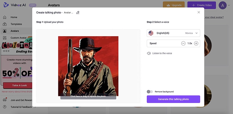 Step 2. Go to Avatars > Talking Photo to upload a photo of Arthur Morgan. Select the voice and speed, and click on the Generate this talking photo button.