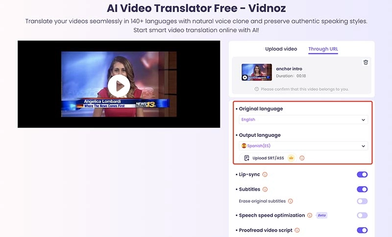 Step 2. Upload a video. Set the original and target languages. Adjust the settings for lip sync, subtitles, speed optimization, and proofread features.
