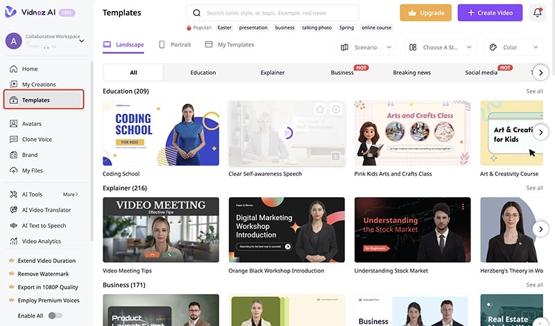 Step 2. Go to Templates and choose one to get started. You can also upload an avatar to create a video.