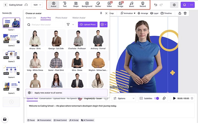 Step 4. Go to the toolbar on top to add more images, stickers, text, etc., to the video. You can also replace the avatar and insert background music.