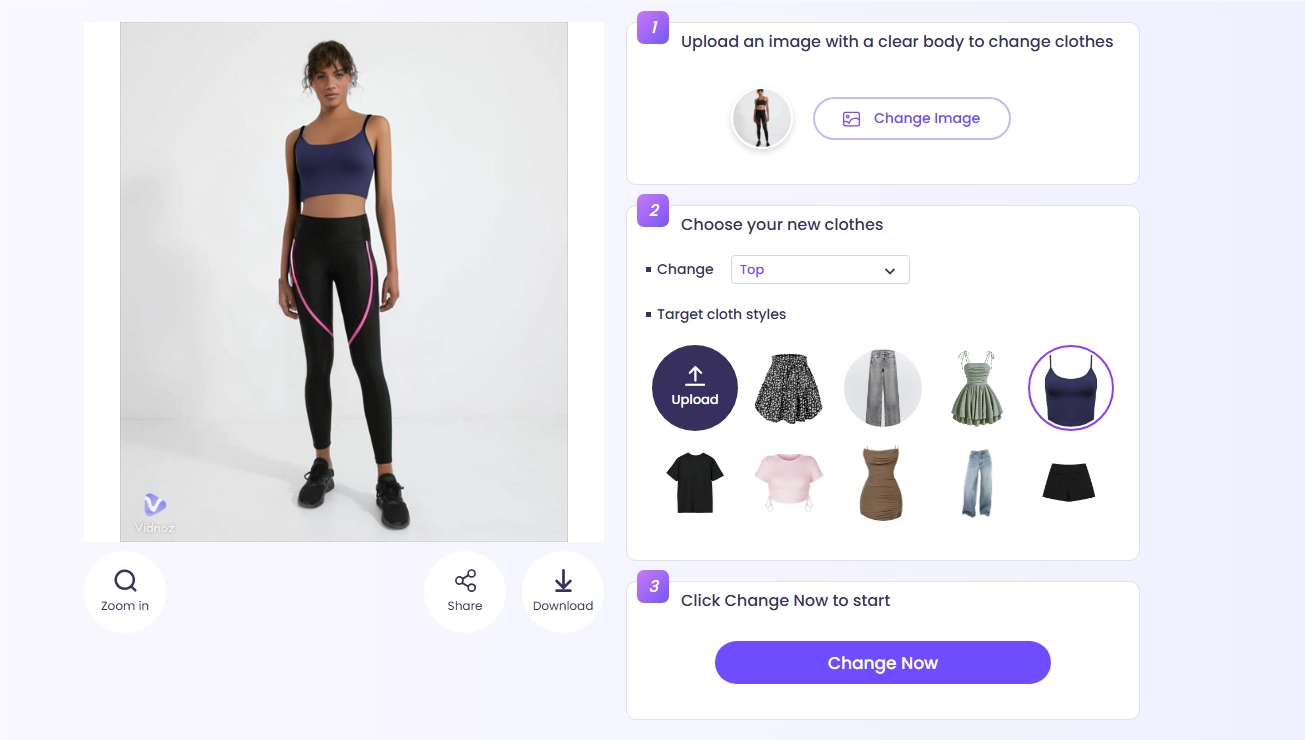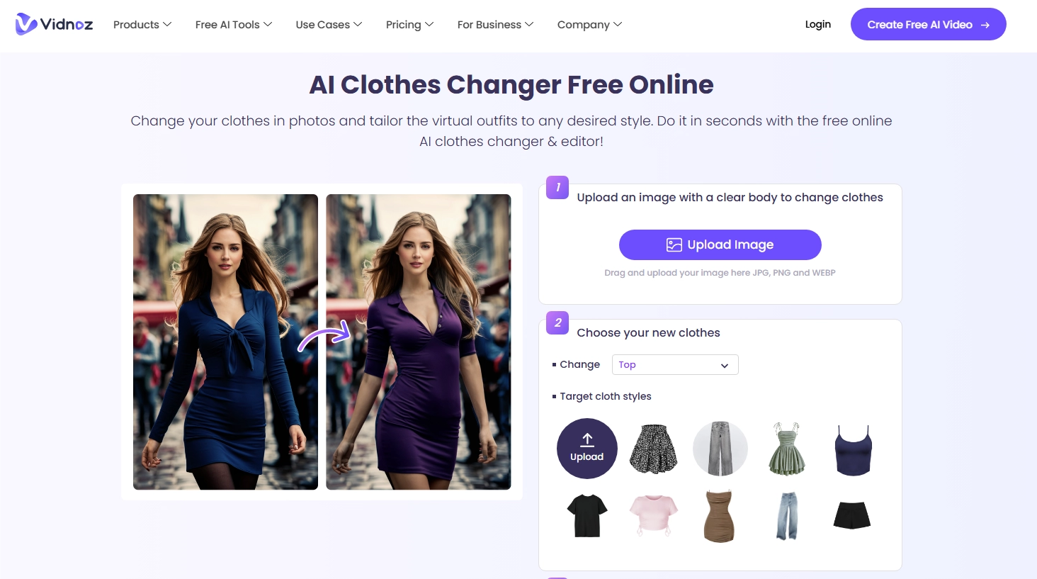 Additionally, if you are also interested in trying on different clothes styles, Vidnoz AI Clothes Changer is an excellent tool. It allows you to change clothes virtually and experiment with various styles in a few easy steps. Try Vidnoz now for easy virtual makeovers and find your perfect look in seconds! You can also try its all-around AI video generator features online for free!