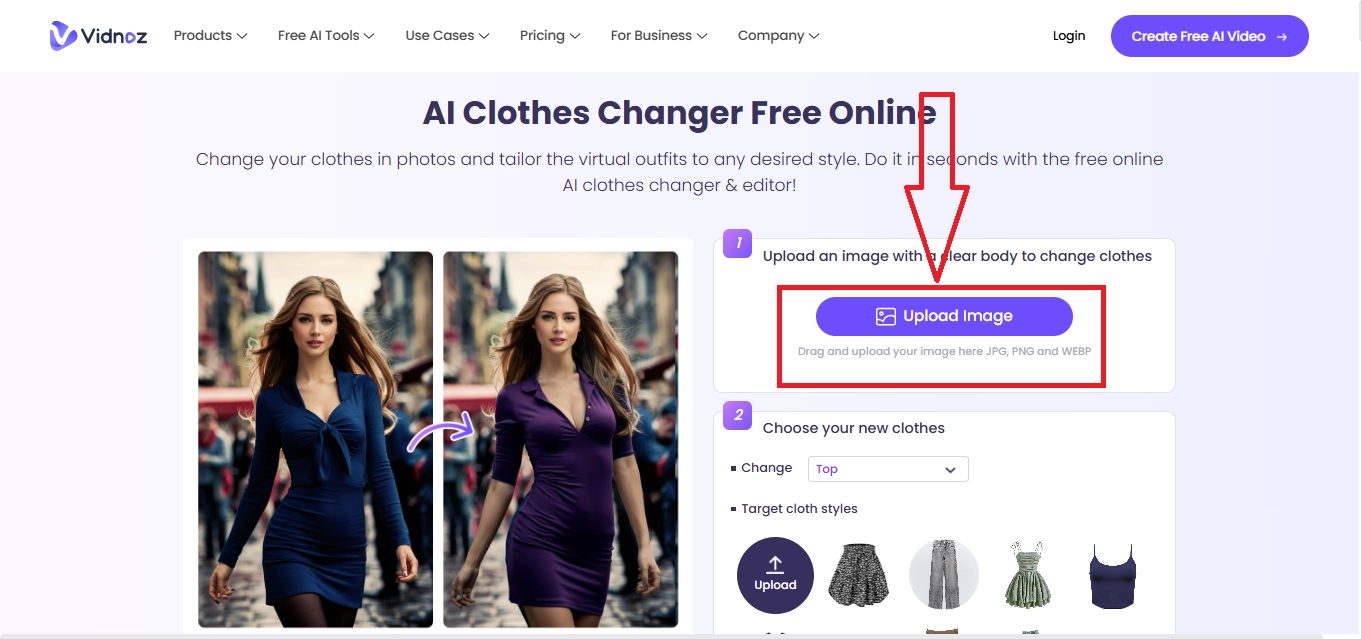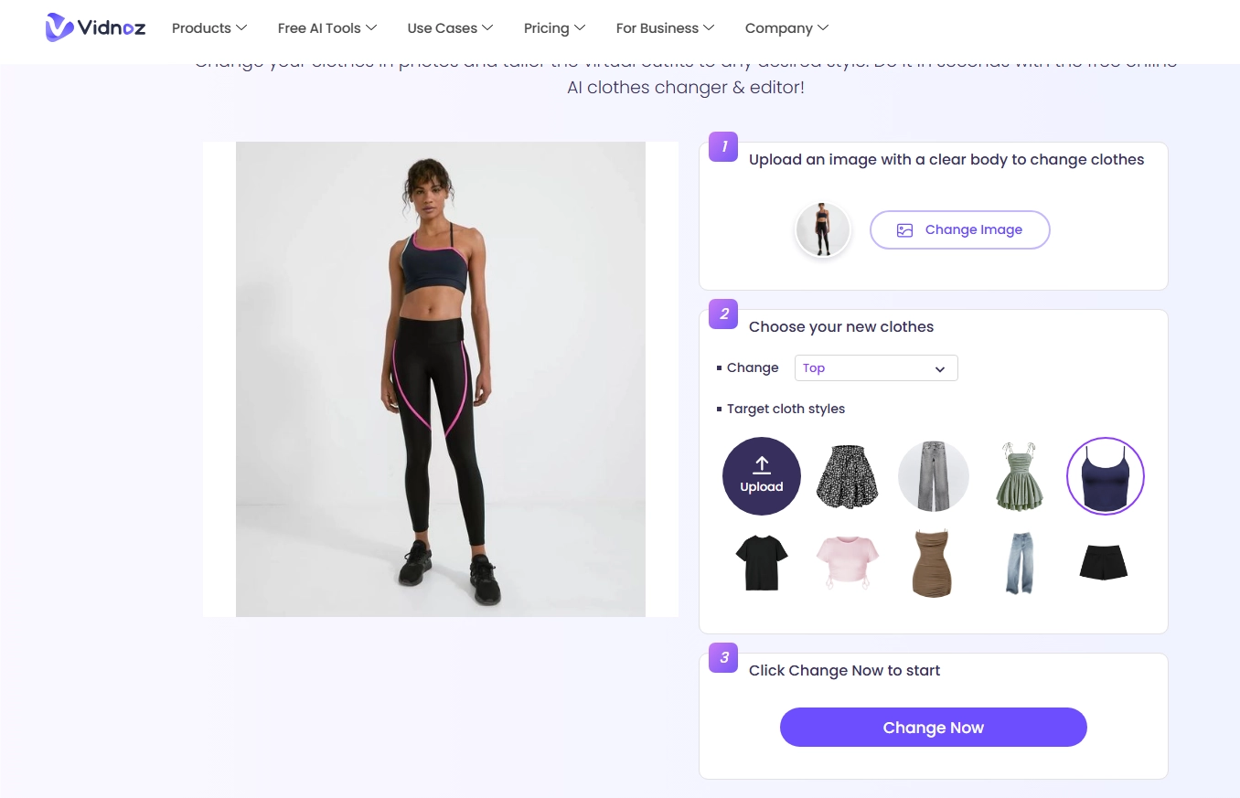Why stop on hair colors? Here, we have the Vidnoz AI Clothes Changer, a powerful tool you can use to virtually test on several style outfits. It can be based on how you want to see your hair color. For anyone who wants to try on various outfits without actually purchasing them, this online tool is ideal. Uploading your photo is simple, and you can try on holiday shorts, formal suits, gowns, and casual attire.