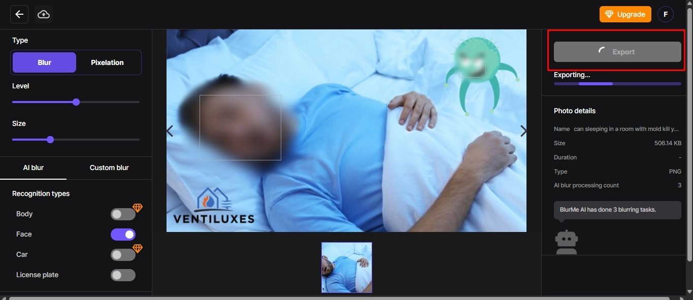 Step 2: Upload the input, select it, perform the blur task, adjust the levels, and click the export button. That’s it; your picture is now safe to share with a blur face in photos.