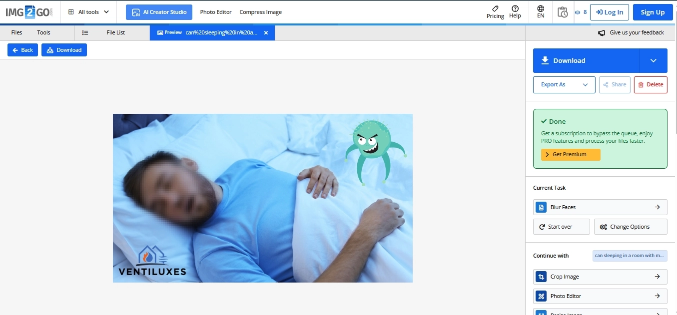 The third on our list to blur face in photos is the IMG2GO, a versatile tool for online face blurring. As soon as you add your picture, you can choose the blur level and size to match the object. Once assigned, it will take some moments to process the image, and then you can preview it and save it on your device.
