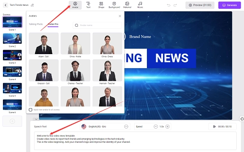 Select from a variety of custom avatars available at your disposal by pressing the "Avatar" button in the top middle of your page; click on the one that best suits your project, and that avatar will appear on your template immediately. There is also a box under your video for "Speech Text," where you can enter the text you want your avatar to speak (You can get more inspiration from the NewsDesk blog’s breaking news gallery); multi-language support, allowing you to create content for a broader demographic; and the option to change the speed of the speech.