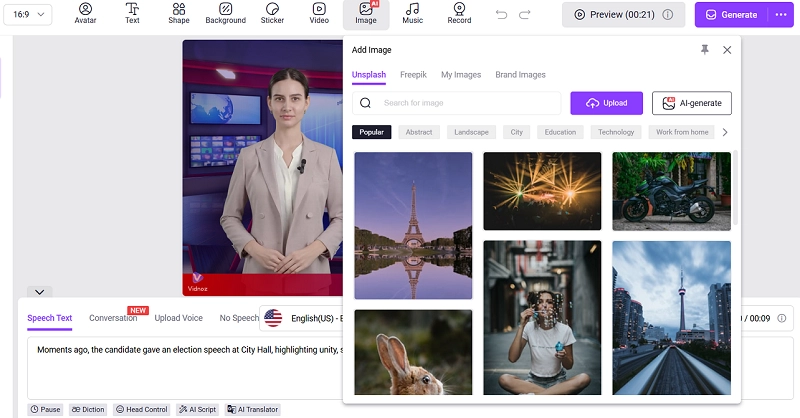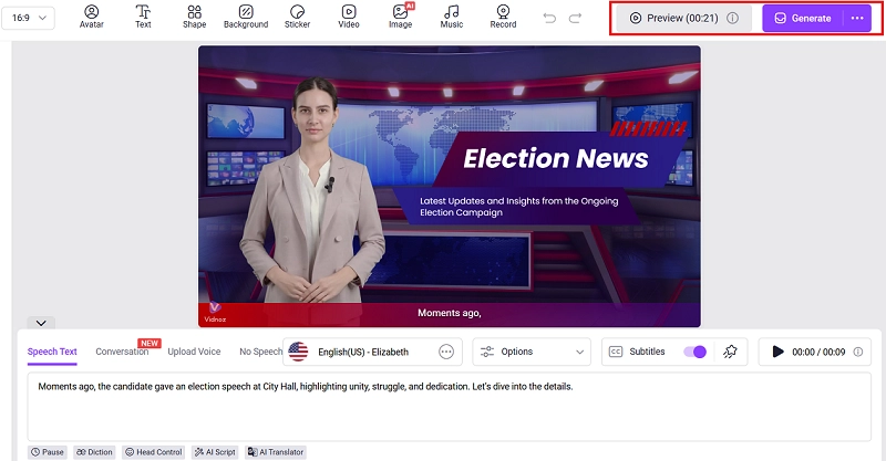 Either edit your news script into your video template in plain text or you can feed your news script to Vidnoz AI “speech text” window and choose to have it be spoken in voiceover or through an AI talking avatar.