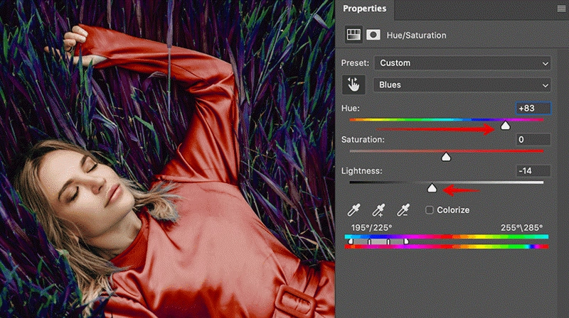 Step 3. In the Properties panel, move the Hue and Saturation sliders to replace the object's color. If the original color tints the new color, check the Colorize box and readjust settings.