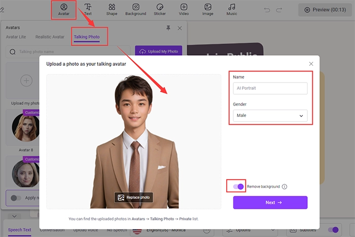 Step 2. If you select a template, you can edit all the elements as you wished. Click on the “Avatar” and change it into your face photo.