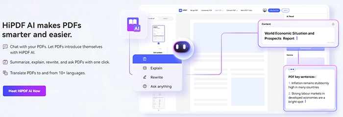 HiPDF is a versatile ChatPDF alternative tool that is designed to handle a wide range of PDF-related tasks, from editing, translating, converting, merging, compressing, to securing PDFs. It also aims to grasp content, summarize texts, and understand PDFs with AI technology. Furthermore, you can convert the summarization into audio by AI text to speech tool for convenient indigestibility.