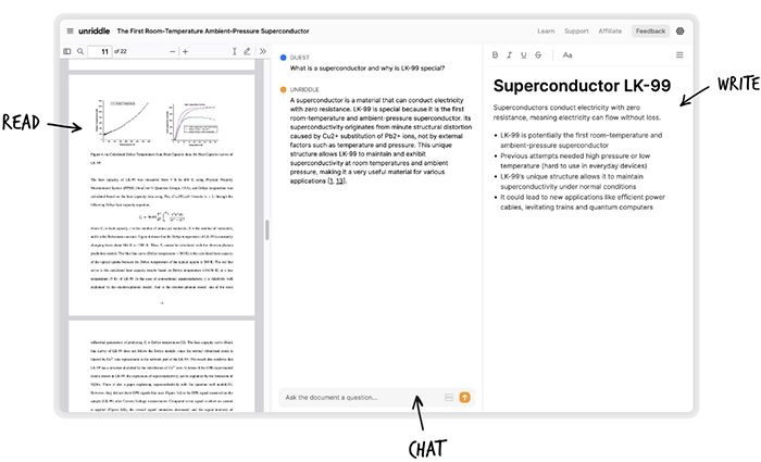 Unriddle AI is a chat PDF AI tool and also a powerful alternative to ChatPDF. It helps you extract the info you need to save your reading time. And it also allows you to take notes, write with AI power, and cite easily. All key points you received from the PDF can be created into videos, audios, and re-write papers through text to video tool, text to speech tool, and AI content generator.