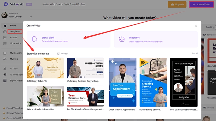 After extracting key points from the lengthy papers, you can create an AI report video from the PDF, and make your face photo speaking for you. That’s what Vidnoz AI free video generator comes with: text-to-speech, voice cloning, 1000+ video templates and talking avatars, and massive social media assets. By using it, all ideas can be easily implemented in creative ways.