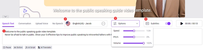 Step 3. Input the key information that is extracted from the PDF files as your script. Select the AI voice to create lip sync animations, and then confirm speaking speed, voice pitch and volume, and also enable the subtitle if you need.