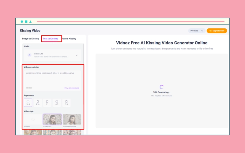 Step 2: Click on “Text to Kissing” and enter your prompt for a cute couple kissing or hugging GIF.