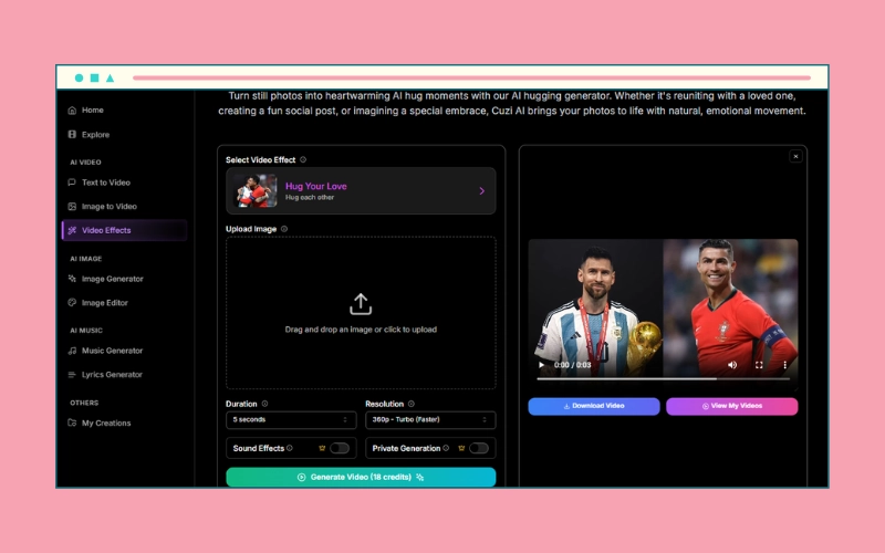 - Fast processing that delivers your realistic AI hug video within minutes.
