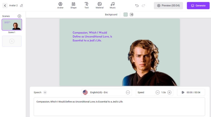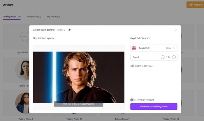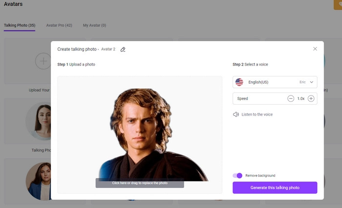 Step 3. Choose a voice for the character and adjust the voice speed. You can preview the voice. If you want to remove the background from the photo, check the Remove background option.
