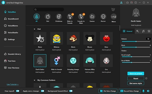 Users may transform their voices into a variety of characters, using the Darth Vader AI voice generator free, 'UnicTool MagicVox' for PC. The program uses artificial intelligence to analyze and modify the user's speech in real-time, producing a Darth Vader-like sound by customizing pitch, speed, and other voice aspects.