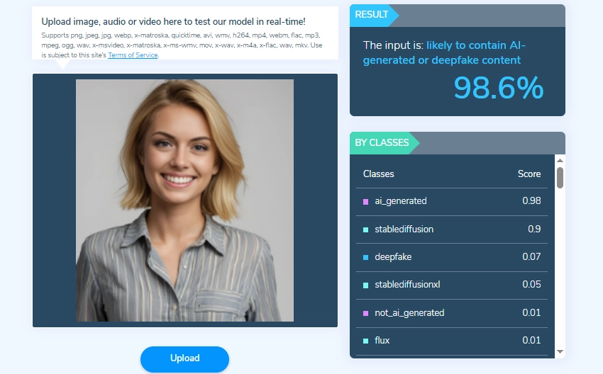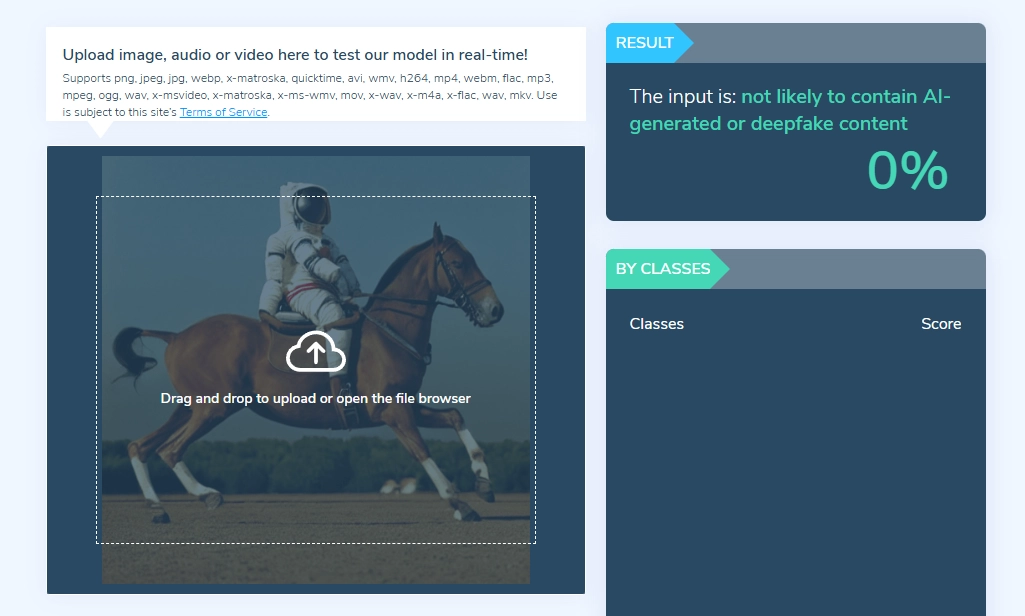 Detects AI-generated content in images, videos, and audio across various file formats.