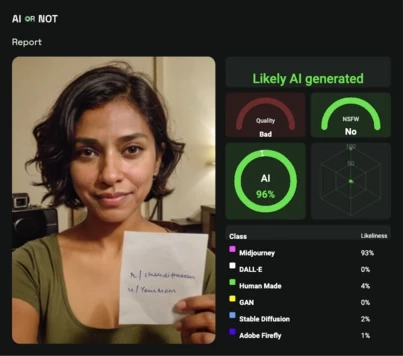 Detects AI-generated images from models like DALL-E and MidJourney.