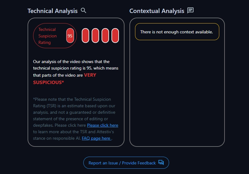 Attestiv is an AI-powered video analysis tool designed to do deepfake tests, video alterations, and suspicious edits. The tool provides a technical suspicion rating to assess how likely it is that the video has been altered.