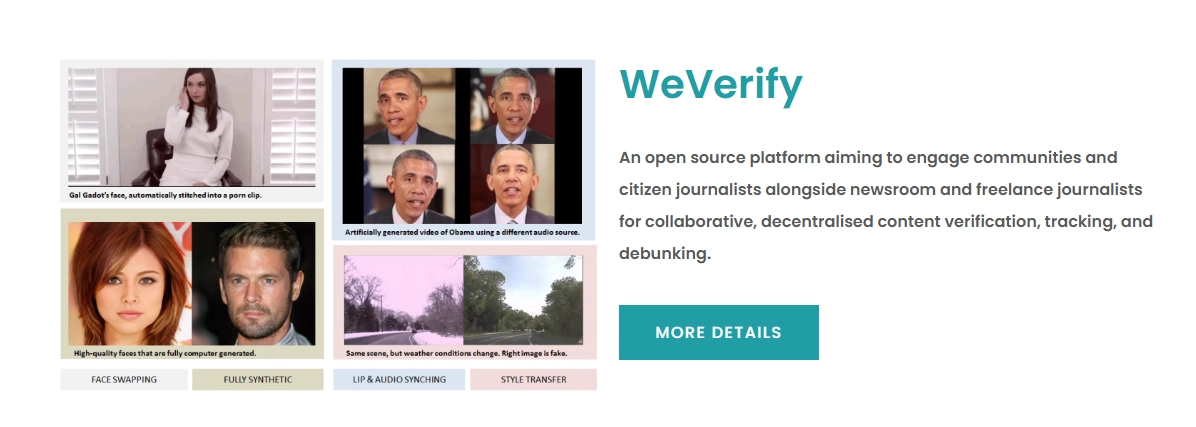 WeVerify is an open-source platform designed for journalists, researchers, and government agencies to detect AI-generated deepfake news and misinformation. It combines machine learning, blockchain verification, and crowdsourced fact-checking to perform deepfake tests.