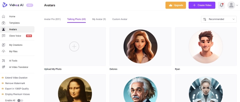 One standout tool for this purpose is the Vidnoz AI video generator. This tool can transform your text into speech with high-quality AI video avatars. The video avatars generated by Vidnoz talking photo online free are lifelike and compelling, enhancing the appeal and persuasiveness of your video content significantly.