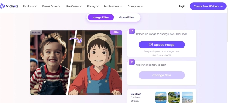Turn portraits into dreamy, animated versions inspired by the beloved Ghibli animation style. If you dream of taking photographs bursting with imagination, then Vidnoz AI Studio Ghibli Filter is for you.