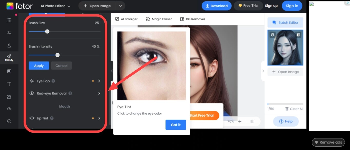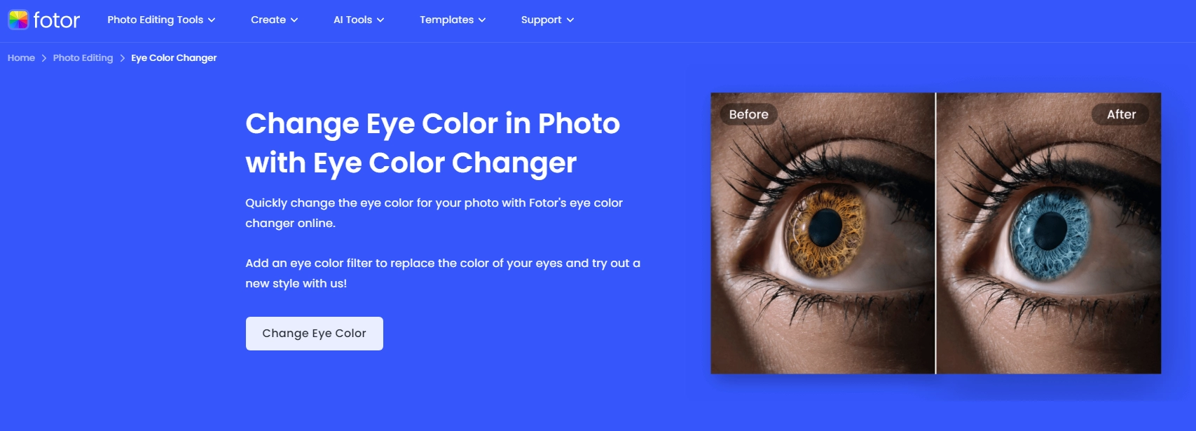 Fotor is a popular free eye color changer photo which means, the tool is capable of changing eye color from your photo. The best part of this eye color changing app is that it is free to use with a user-friendly interface. The company has developed its application in a way that is suitable both for Windows and MacOS devices to change eye colors.