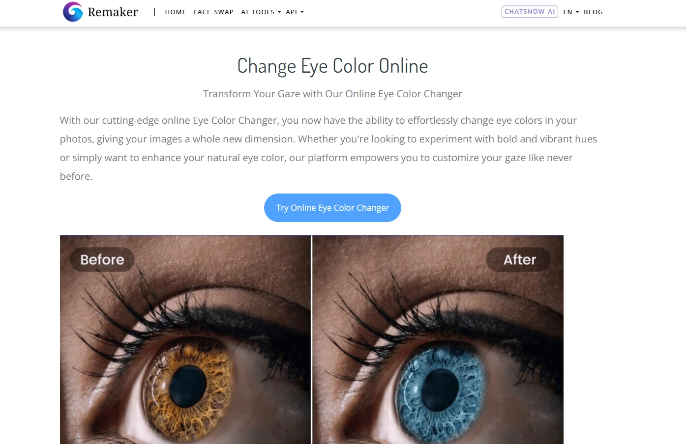 Remaker is a super easy eye color changing app online that allows users to change color in only three steps. It also has a good reputation to replace face in video online free. Basically, it generates the modified image almost instantly with a vast color palette to choose from. If you are looking for an eye color changer online with realistic results, Remaker is the go-to app for you.
