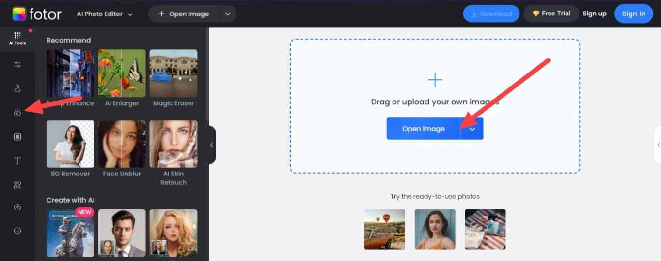 Step 1. Go to the Fotor website and click on “Change Eye Color”. You will be redirected to the Fotor editing interface. Now, upload your photo and click on the “Beauty” icon from the left panel.